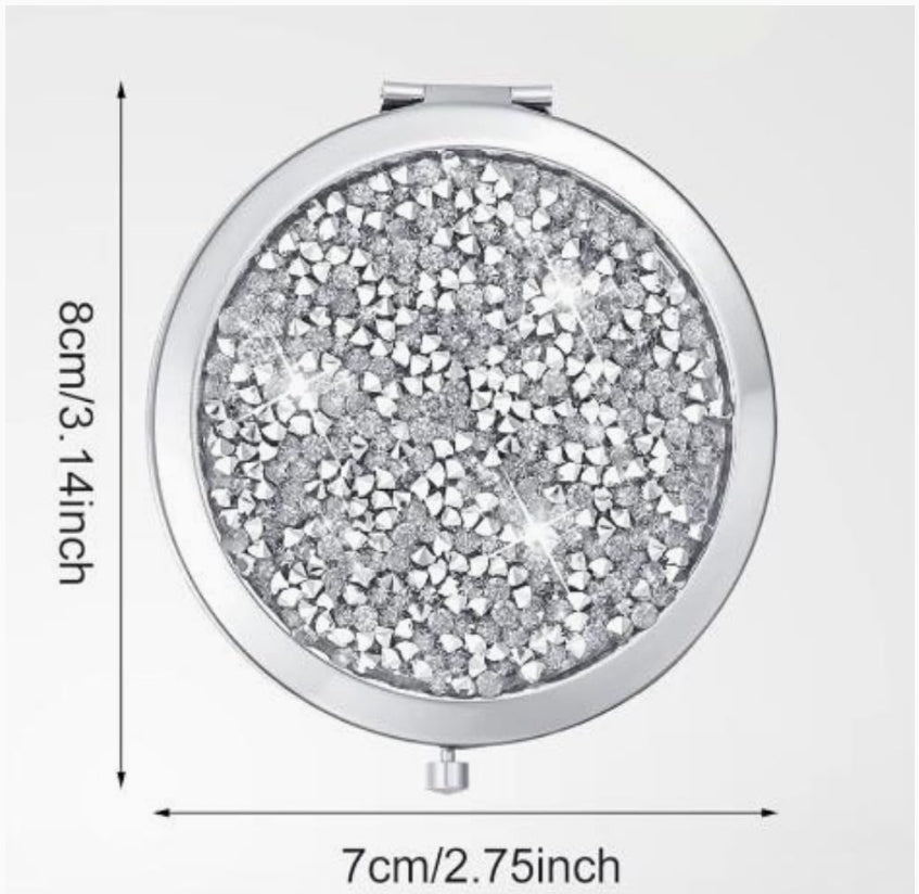 This double-sided compact mirror features both regular and magnifying mirrors, allowing for detailed makeup application and on-the-go touch-ups. Available in silver or purple mixed diamond design, this compact mirror is both stylish and practical. Perfect for any makeup lover or beauty enthusiast.
