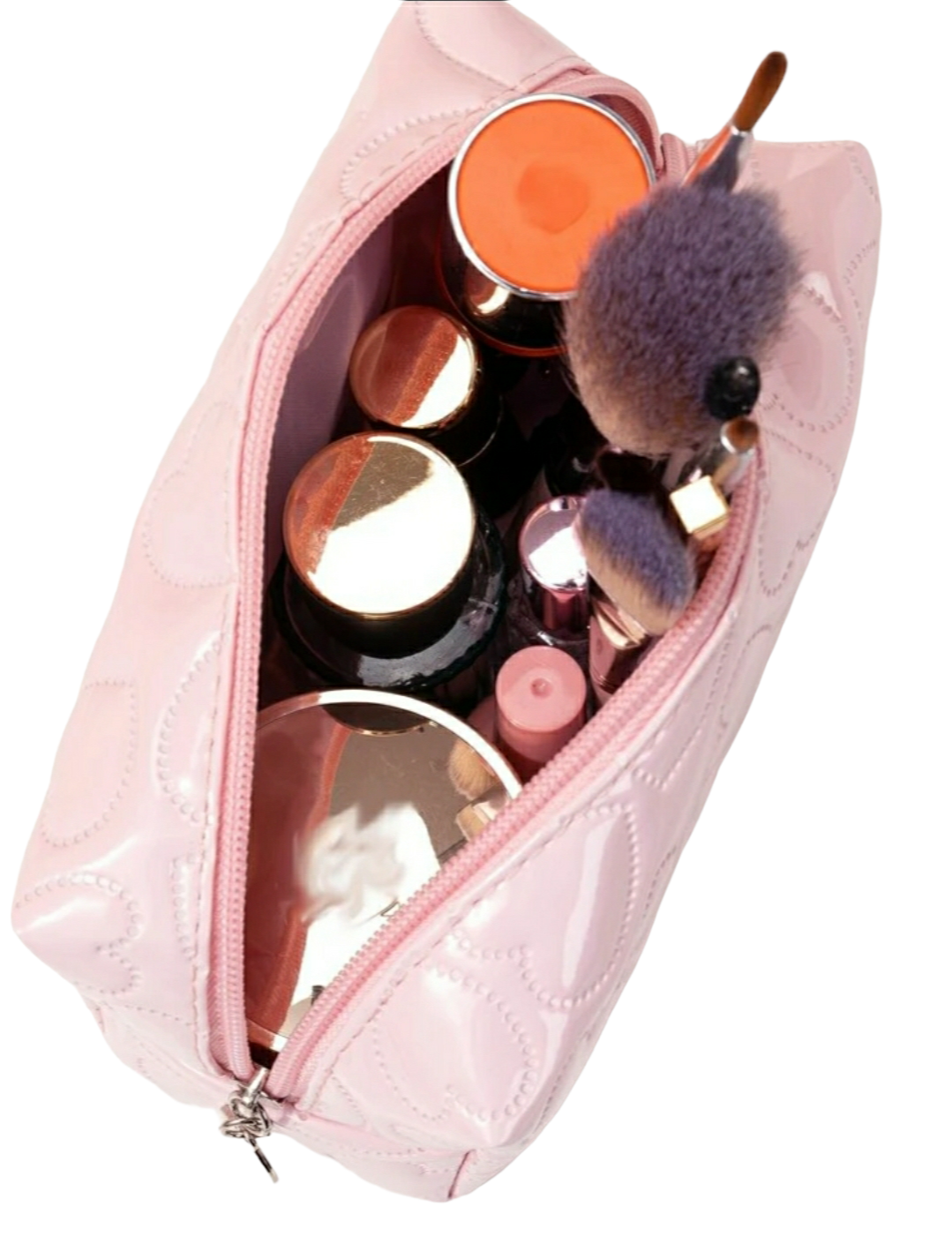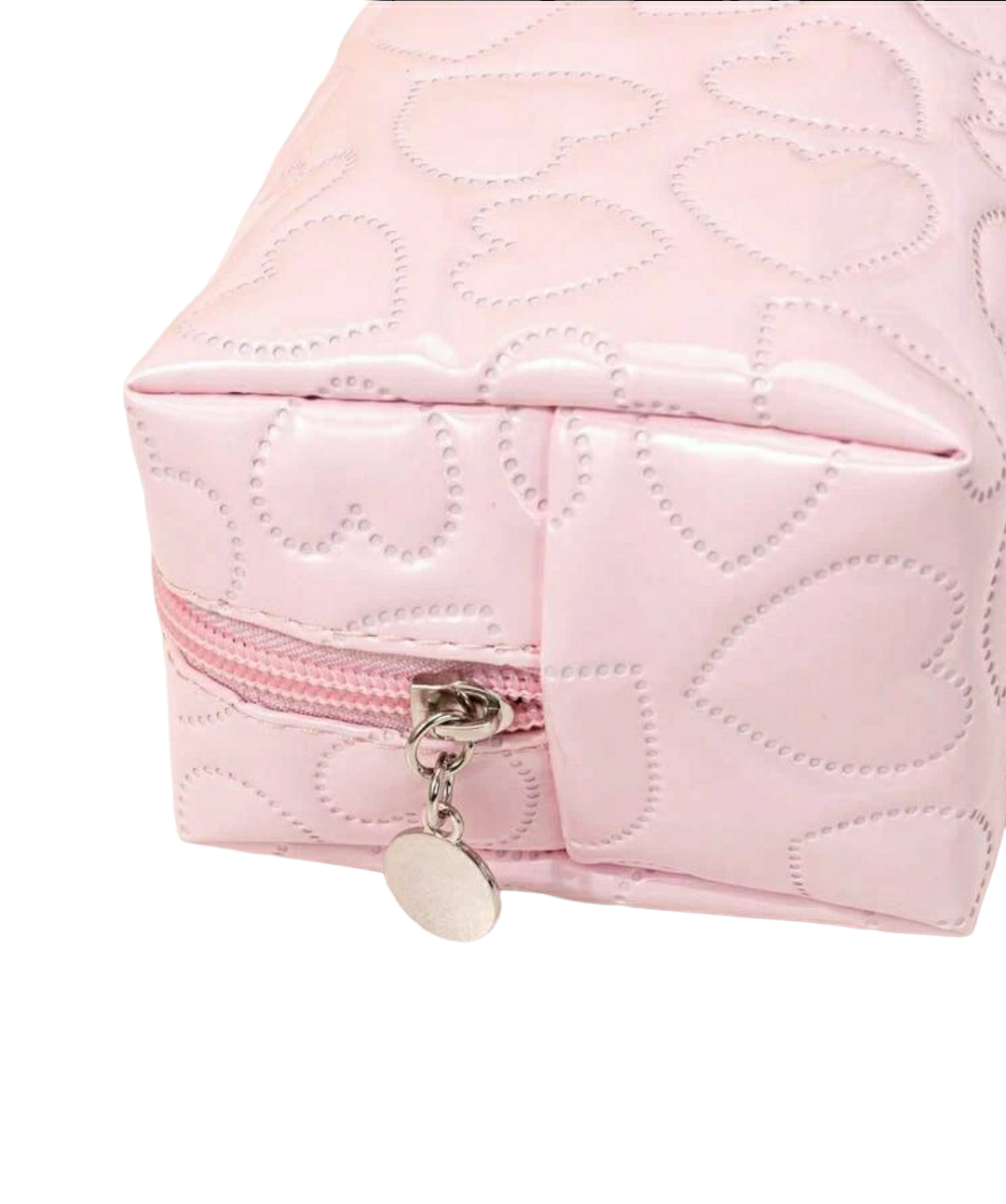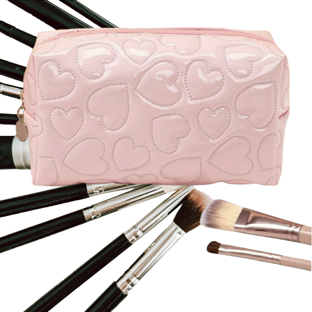 Add a touch of girly charm to your makeup routine with this beautiful pink heart quilted makeup bag. Perfect for storing all of your cosmetics and essentials. Keep your supplies organized and protected in this chic pink heart quilted makeup bag.